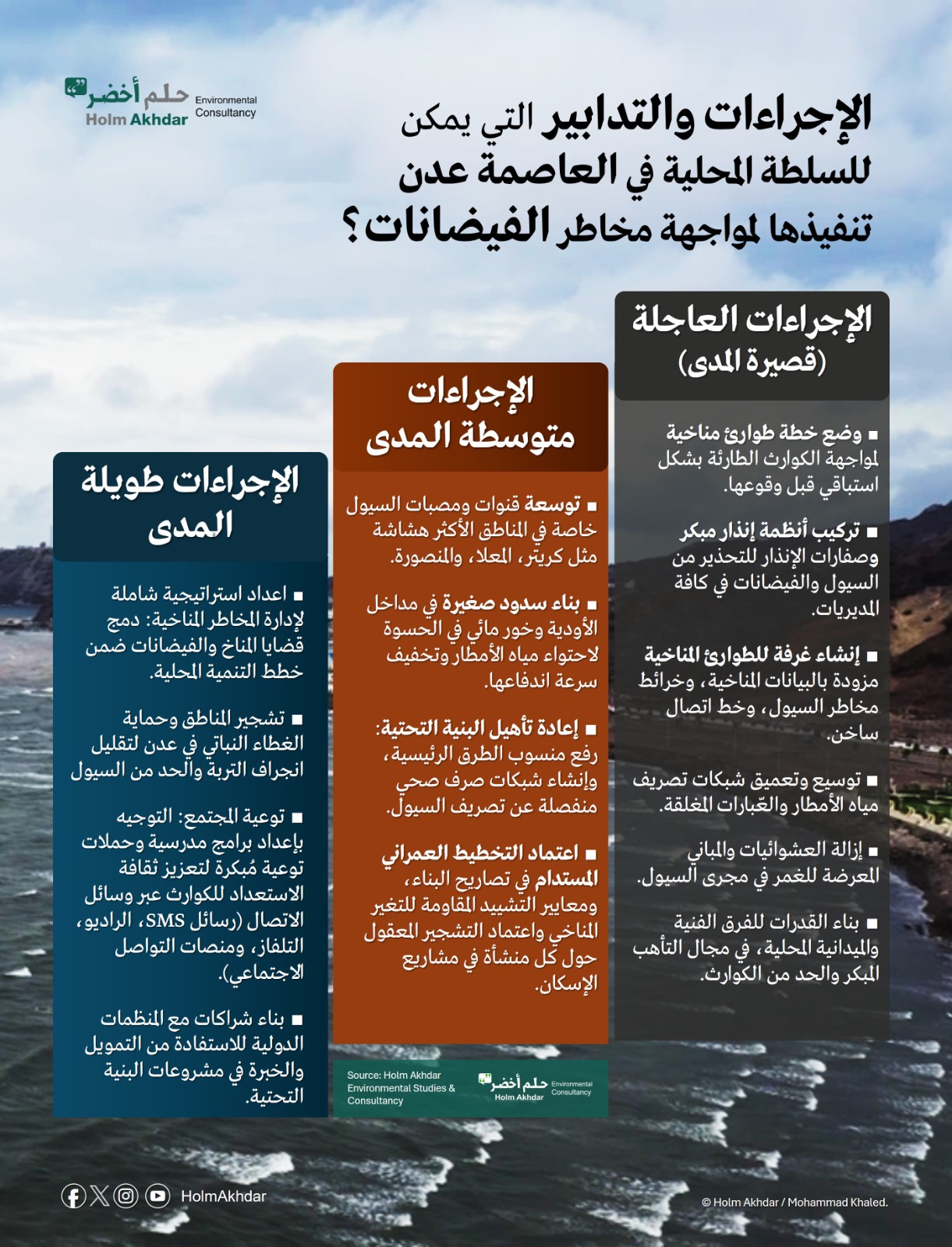 وفي هذا السياق، يدعو حلم أخضر للدراسات والاستشارات البيئية، سلطات العاصمة عدن، ممثلة بوزير الدولة، محافظ المحافظة، معالي الأستاذ أحمد لملس، إلى اتخاذ قرارات مستنيرة للتصدي لتأثيرات تغير المناخ، واتباع نهج التكيف والمرونة المناخية، وإدارة الكوارث بشكل فعال.