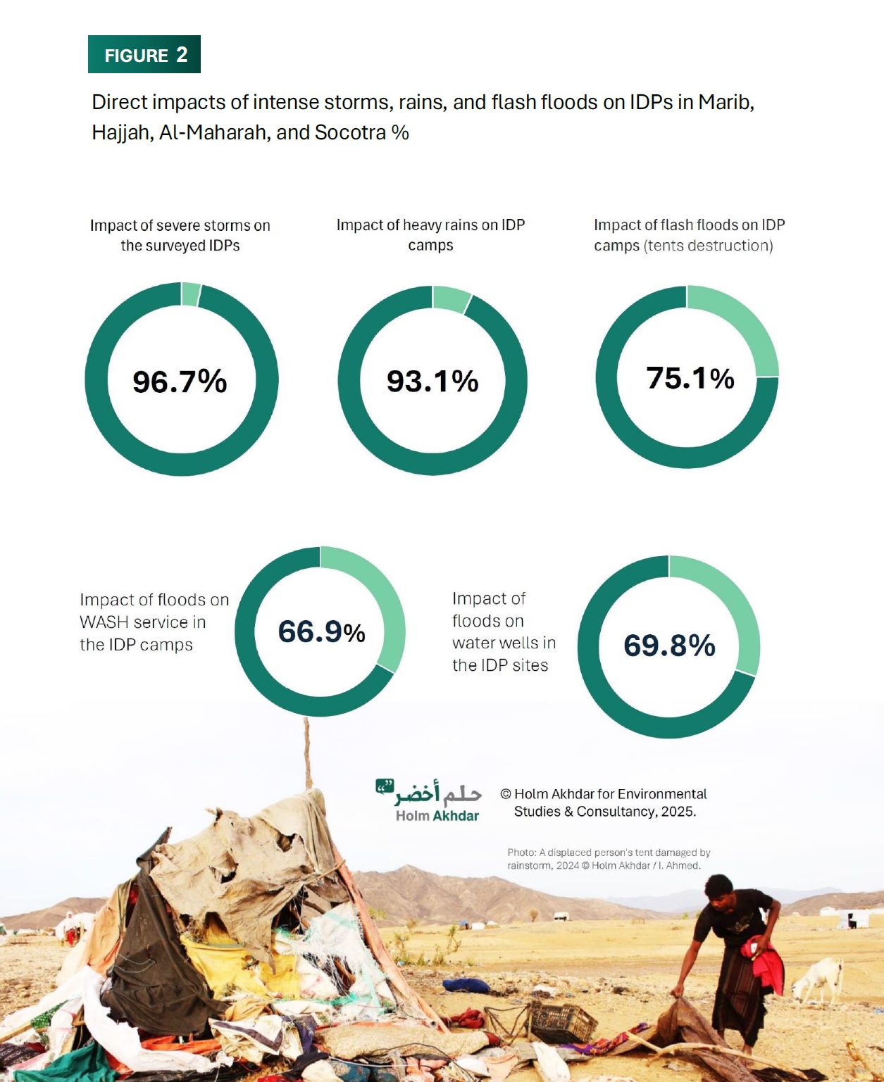 The study findings revealed that approximately 69.8% of IDPs were affected by flood damage to water sources, impacting their livelihoods (see FIGURE 2). Additionally, 66.9% of respondents in these governorates reported that torrents and floods hindered their access to water, sanitation, and hygiene (WASH). Many displaced people described this year’s floods as “unprecedented.”