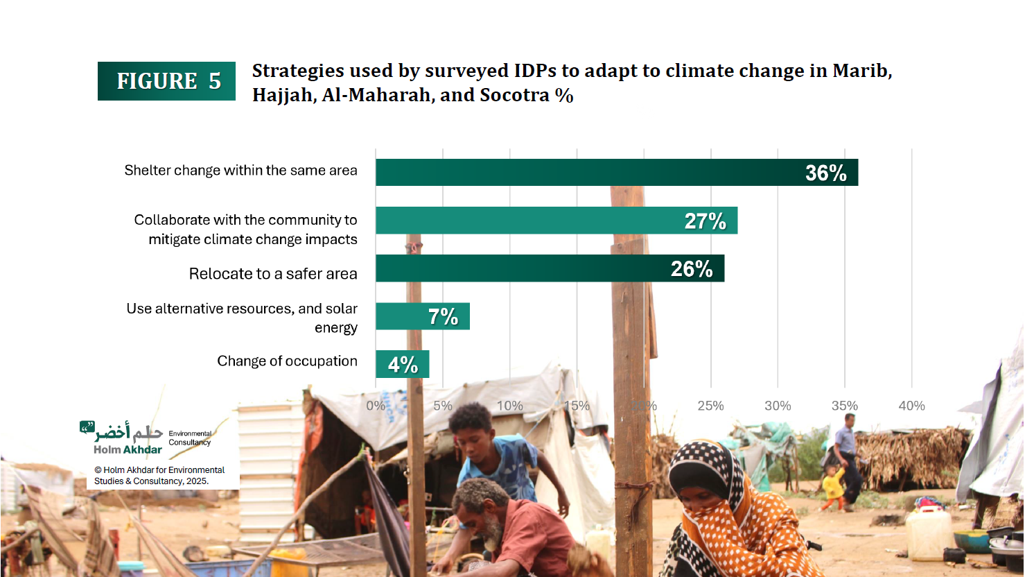 Another 7% of IDPs have employed alternative energy technologies in their camps as a means of adapting to climate risks. In Al-Maharah, Marib and Hajjah governorate, 4% of them were compelled to change their professions or occupations. Key actors in Yemen should focus on climate change mitigation and adaptation as the main strategies to respond to climate change.