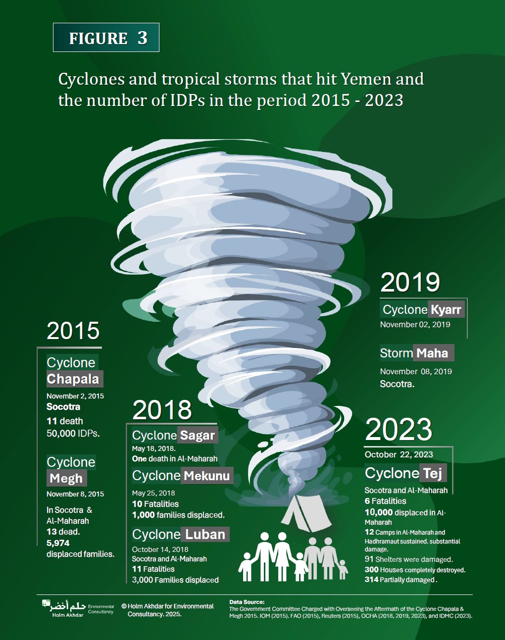 This study examines the impact of climate change on IDPs in Yemen across six chapters, focusing on IDPs in Marib, Hajjah, Al-Maharah, and Socotra. To understand the displacement and climate change related to natural resources, this study aimed to identify the impact of climate change on IDPs in Yemen and to investigate the relationship between climate change and internal displacement in the country. It sought to understand the causes and factors from stakeholders’ perspectives, as well as to comprehend the direct climate impacts and the compounding effects of climate change on IDPs.