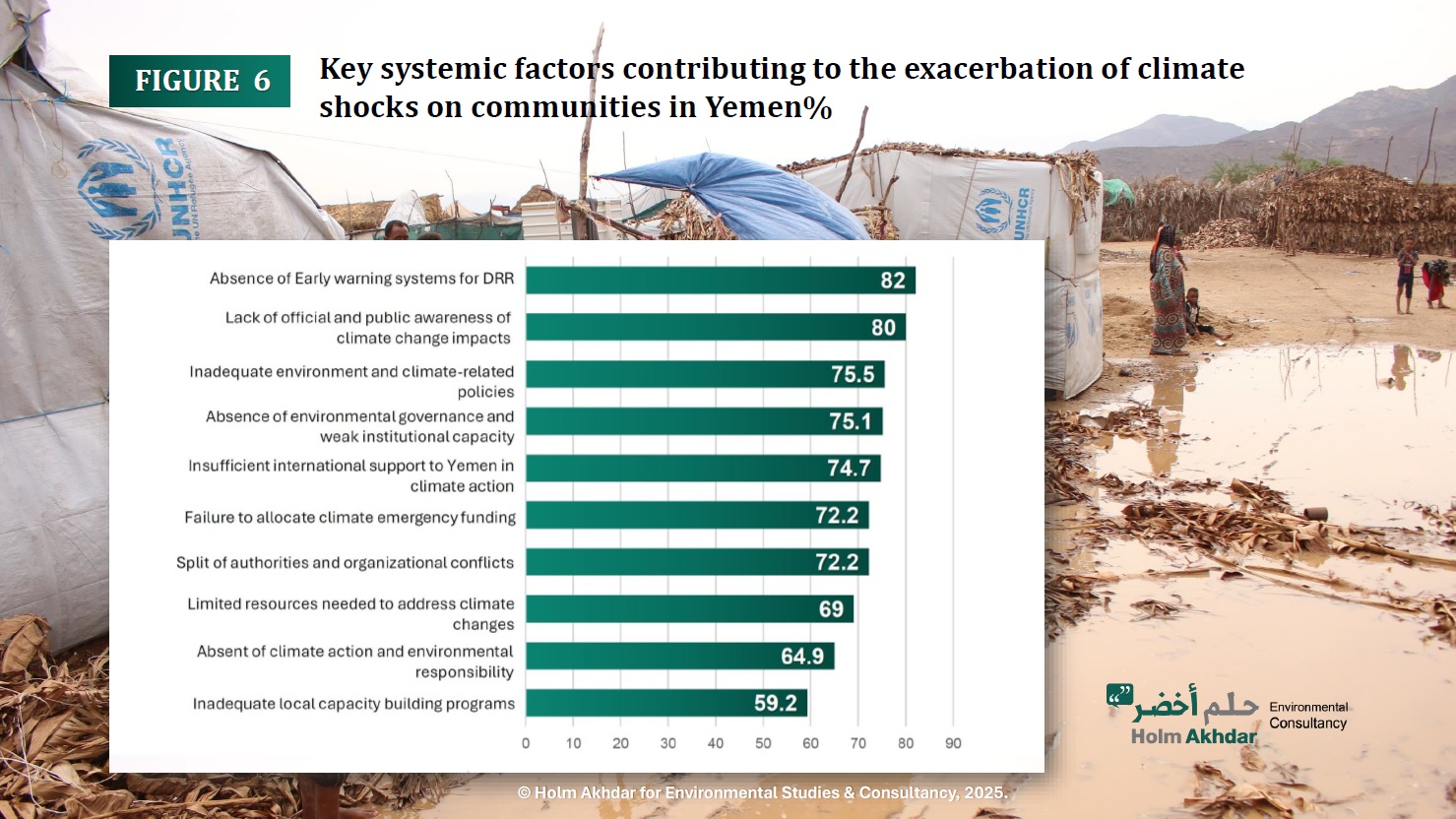 FIGURE 6 illustrates the most significant factors, accounting for 82% of the IDPs respondents, which is absence of early warning systems EWS to effectively alert local communities of climate-related disasters. In addition, all shelter camps in Yemen have no EWS for disaster risk reduction DRR, including camps in the regions of Marib, Al Maharah, Hajjah, and Socotra. This is closely followed by 80% limited official awareness regarding the severity of climate change and the necessary preparations to mitigate its impacts.