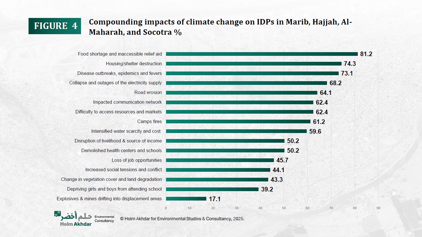 Survey results presented in FIGURE 4 indicate that food shortages and difficulty accessing relief assistance are among the most prominent compounding impacts of climate change, affecting 81.2% of IDPs in Marib, Hajjah, Al-Maharah, and Socotra. These challenges are further exacerbated when camps are struck by rainstorms or flash floods, which destroy supplies.